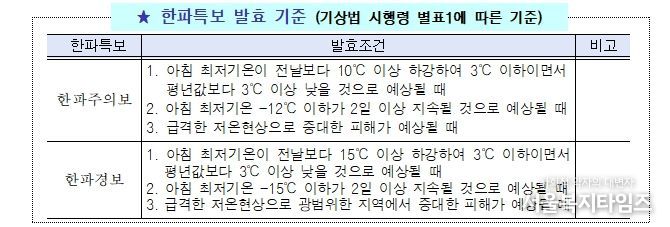 한파특보 중 ‘한파주의보’는 아침 최저기온이 전날보다 10℃ 이상 하강하여 3℃ 이하이면서 평년값보다 3℃ 이상 낮을 것으로 예상되거나 아침 최저기온이 전날보다 12℃ 이하인 날이 2일 이상 지속될 것으로 예상될 때 발효된다.