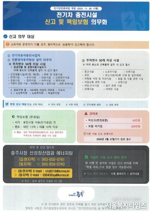 이미 운영 중인 기존 충전시설의 경우에도 법 시행일인 2025년 11월 28일부터 6개월 이내인 2026년 5월 27일까지 신고와 배상책임보험 가입을 완료해야 하며, 이를 이행하지 않을 경우 과태료가 부과된다.