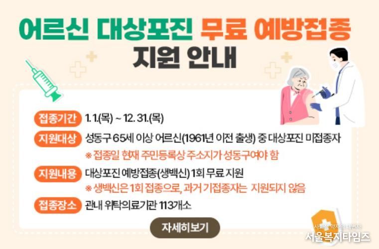 서울복지타임즈 이재연 기자 | 서울 성동구는 2026년 1월 1일부터 65세 이상 어르신을 대상으로 대상포진 무료 예방접종을 실시한다고 밝혔다. 접종 대상은 1961년 12월 31일 이전 출생자로, 성동구에 주민등록을 둔 구민이다.