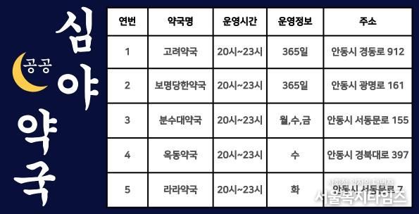 서울복지타임즈 이재연 기자 | 안동시는 시민의 의약품 접근성을 높이고 심야 시간대 의료 공백을 해소하기 위해 1월 1일부터 공공심야약국을 기존 2개소에서 5개소로 확대 지정해 운영 중이다.