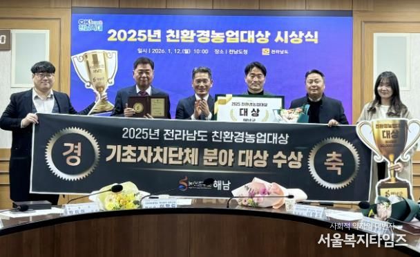 서울복지타임즈 이재연 기자 | 해남군이 전라남도‘2025년 친환경농업대상’평가에서 대상을 수상했다. 2년연속 대상 수상으로, 우리나라 친환경농업 선도 지자체의 위상을 확고히 했다. 해남군은 상사업비 8,000만원도 확보했다.