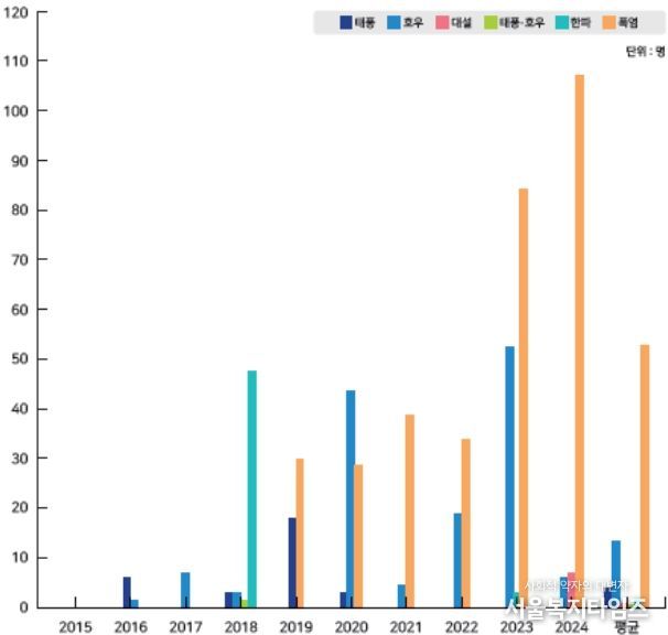 자연재난으로 인한 사망·실종자는 총 121명으로, 최근 10년 평균(56명) 대비 65명 증가했다. 원인별로는 폭염으로 인한 사망(108명)이 가장 많았고, 이 외 대설(7명), 호우(6명) 순으로 많았다.