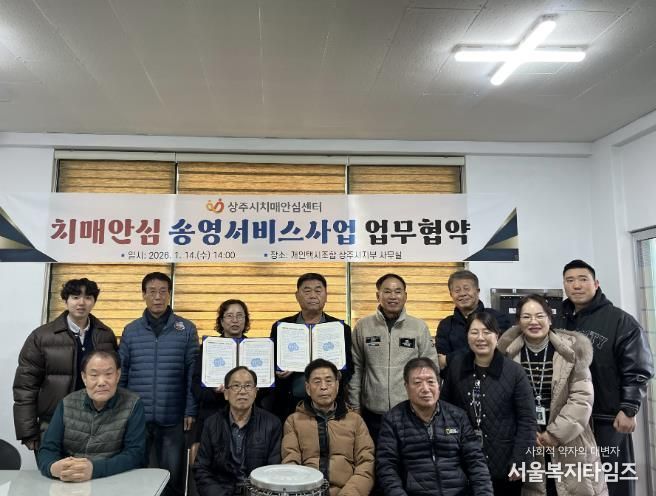 서울복지타임즈 이재연 기자 | 상주시치매안심센터는 1월 14일 경북개인택시운송사업조합 상주시지부와 ‘치매안심 송영서비스’ 운영을 위한 업무협약을 체결하고, 치매어르신의 안전한 이동 지원을 위한 협력체계를 구축했다.