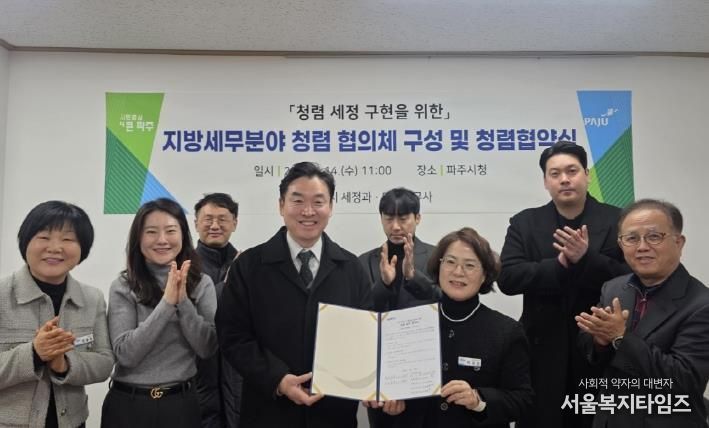 서울복지타임즈 이재연 기자 | 파주시는 지난 14일 파주지역세무사회(마을세무사)와 함께 청렴 문화의 정착과 확산을 위한 민관 청렴협의체를 구성하고, 청렴 실천을 위한 협약을 체결했다고 밝혔다.