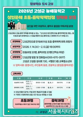서울복지타임즈 이재연 기자 | 고성군은 학력 취득을 희망하는 성인 학습자를 위한 학력인정 문해교육 프로그램인 ‘고성군 늘배움학교’의 2026학년도 입학생을 모집한다.