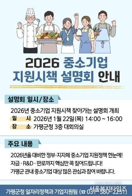 가평군은 관내 중소기업을 대상으로 ‘2026년 중소기업 지원시책 설명회’를 오는 22일 오후 2시 가평군청 3층 대회의실에서 개최한다고 밝혔다. 이번 설명회는 2026년도 중소기업 지원정책을 종합적으로 소개하는 한편 기업 현장의 애로사항을 직접 청취해 정책 수요에 반영하기 위해 마련됐다. 설명회에는 중소벤처기업진흥공단, 기술보증기금, 소상공인진흥공단, 경기중소벤처기업청 등 10개 기관이 참여한다.