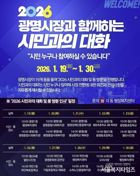 한편, 구체적인 방문 일정은 ▲19일 오전 10시 광명1동, 오후 2시 광명2동 ▲20일 오전 10시 광명3동, 오후 2시 광명4동 ▲21일 오전 10시 광명5동, 오후 2시 광명6동 ▲22일 오전 10시 광명7동, 오후 2시 철산1동 ▲23일 오전 10시 철산2동, 오후 2시 철산3동 ▲26일 오전 10시 철산4동, 오후2시 하안1동 ▲27일 오전 10시 하안2동, 오후 2시 하안3동 ▲28일 오전 10시 하안4동, 오후 2시 소하1동 ▲29일 오전 10시 소하2동, 오후 2시 일직동 ▲30일 오전 10시 학온동이다.