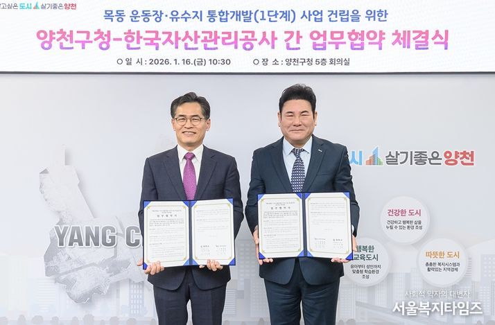 서울복지타임즈 이재연 기자 | 양천구가 1월 16일 한국자산관리공사와 업무협약을 체결하며, 목동운동장·유수지 일대 통합개발(목동MICE)을 위한 첫걸음을 내디뎠다.