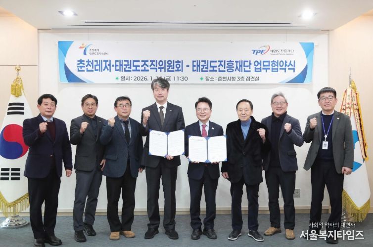 서울복지타임즈 이재연 기자 | 춘천레저·태권도조직위원회(위원장 육동한)와 태권도진흥재단(이사장 김중헌)이 16일 태권도 발전과 국제 경쟁력 강화를 위해 손을 맞잡았다.