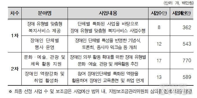 지원사업 1차 공모는 오는 23일(금) 18시까지로 ▴장애 유형별 맞춤형 복지서비스 제공 ▴장애인 단체별 행사 운영 분야를 대상으로 진행되며 결과는 2월 중 발표할 예정이다. 2차 공모 접수는 2월 10일부터 2월 20일 18시까지이며 ▴문화·예술·관광·체육활동 ▴장애인 역량 강화 및 취업 활성화 분야이다.