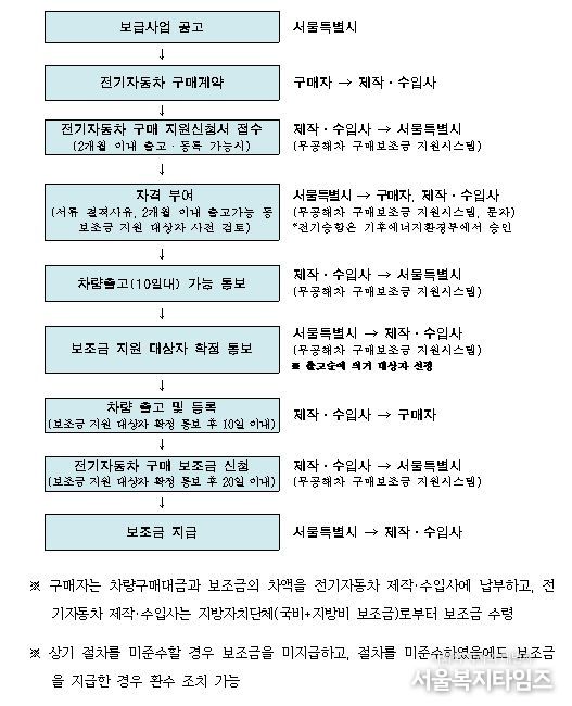구매희망자는 자동차 제작·수입사와 계약을 체결하고, 제작·수입사가 서울시에 보조금을 신청하면 출고·등록 순으로 지원 대상자가 선정된다. 보조금은 차량 출고 및 등록 후 서울시가 제작·수입사에 직접 지급하며, 구매자는 보조금을 제외한 금액만 납부하면 된다.