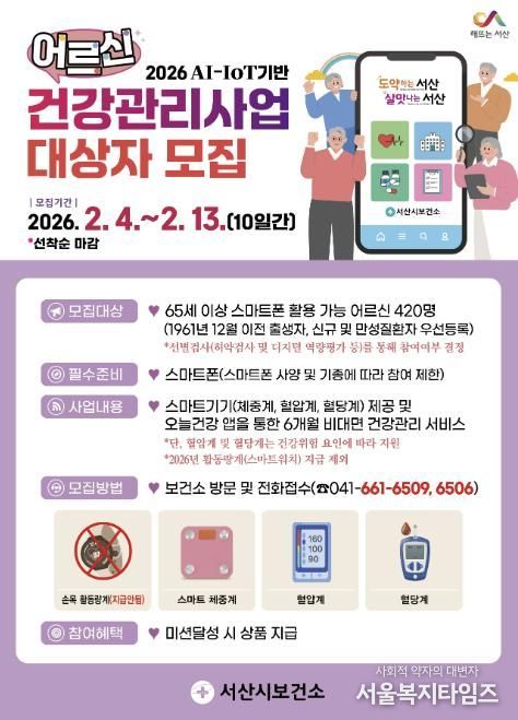 서울복지타임즈 이재연 기자 | 충남 서산시가 인공지능(AI)·사물인터넷(IOT) 기반 어르신 건강관리사업의 대상자를 모집한다고 밝혔다.