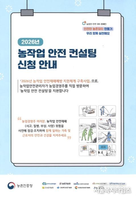 서울복지타임즈 이재연 기자 | 안동시는 농업 분야 중대재해 예방과 안전한 농작업 환경 조성을 위해 '2026년 농작업 안전재해예방 지원체계 구축사업'의 일환으로 ‘농작업 안전보건관리 컨설팅’ 참여농가를 모집한다고 1월 16일(금) 밝혔다.