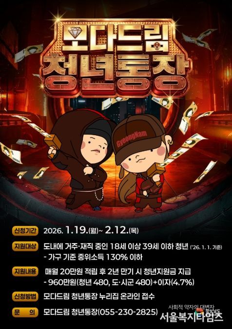 서울복지타임즈 이재연 기자 | 경상남도와 경남투자경제진흥원은 청년의 자산 형성과 지역 정착을 돕는 ‘모다드림 청년통장’ 상반기 참여자를 1월 19일부터 2월 12일까지 모집한다고 밝혔다.