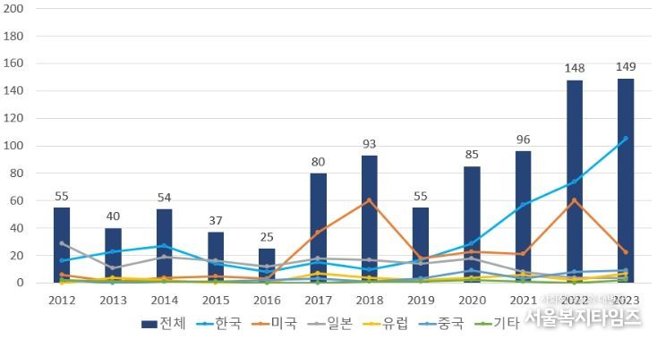 같은 기간 연평균 증가율도 한국이 18.7%로 가장 높았고, 그 다음은 중국(14.7%)과 미국(12.5%)이었으며, 유럽연합(5.8%)과 일본(-19.8%)은 주요국의 연평균 증가율 9.5%보다 매우 낮거나 감소세를 보였다.