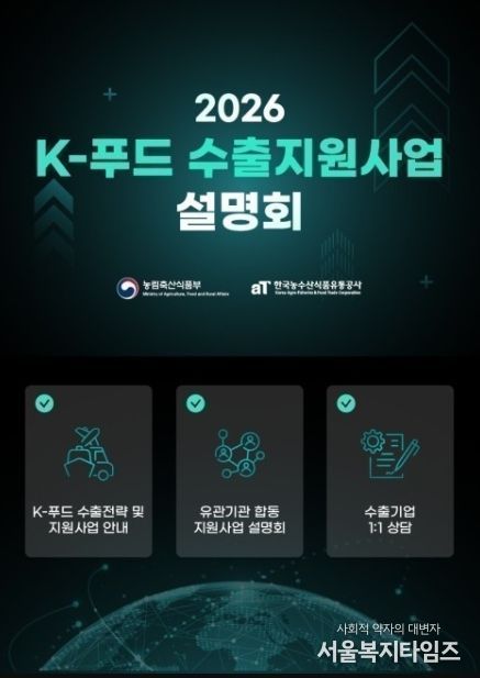 서울복지타임즈 이재연 기자 | 농림축산식품부는 K-푸드의 글로벌 진출 확대를 위해 전년보다 900억원 증가한 7,070억원 규모의 2026년 K-푸드 수출지원사업 설명회를 1월 23일 서울 과학기술컨벤션센터에서 개최한다고 밝혔다.