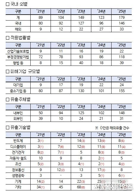 유출 기술별로는 ▵기계(15건, 8.3%) ▵디스플레이(11건, 6.1%) ▵반도체(8건, 4.5%) ▵정보통신(8건, 4.5%) ▵이차전지(8건, 4.5%) ▵생명공학(6건, 3.4%) ▵자동차·철도(5건, 2.8%) 등 순으로 나타났다.