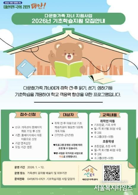 군은 다문화가족 자녀의 학습 격차를 해소하고 안정적인 학교 적응을 돕기 위해, 관내 5~9세 아동을 대상으로 기초 학습을 무료로 제공하는 ‘2026년 기초학습지원 사업’을 태안군 가족센터에서 추진한다고 밝혔다.