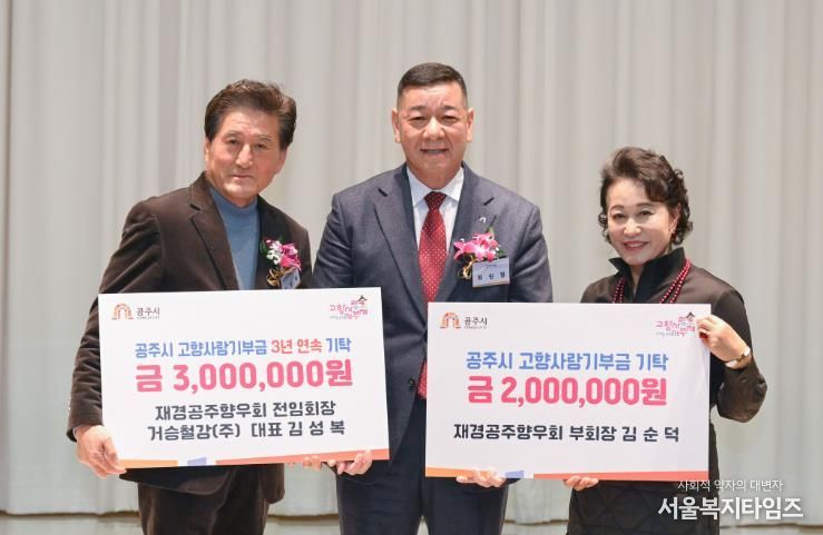 20일 공주시에 따르면, 김순덕 재경공주향우회 상임부회장과 김성복 전임 회장은 각각 200만 원과 300만 원을 기부하며 고향 발전에 대한 뜻을 보탰다.