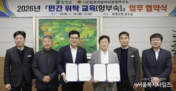 서울복지타임즈 이재연 기자 | 전남 함평군이 “지난 19일 (사)한국지방자치경영연구소와 군민 평생교육(향부숙) 위탁 교육 추진을 위한 업무 협약(MOU)을 체결했다”고 20일 밝혔다.