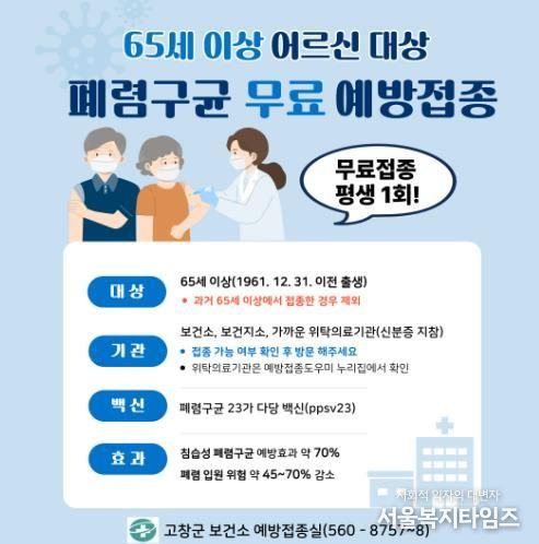 서울복지타임즈 이재연 기자 | 고창군보건소가 1961년생 이상 어르신을 대상으로 폐렴구균 예방접종을 무료로 실시한다.