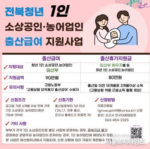 서울복지타임즈 이재연 기자 | 군산시가 임신과 출산으로 인한 경영 공백과 인력 채용에 어려움을 겪는 청년 1인 소상공인과 농어업인을 지원하기 위해 ‘청년 1인 소상공인·농어업인 출산급여 지원’ 사업을 추진한다.
