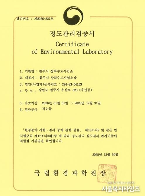 서울복지타임즈 이재연 기자 | 원주시 먹는물 검사기관이 국립환경과학원이 주관한 ‘2025년 먹는물 검사기관 정도관리 평가’에서 엄정한 심사를 거쳐 ‘적합’ 판정을 받았다. 이에 따라 2026년 1월 1일부터 2028년 12월 31일까지 유효한 ‘정도관리 검증서’를 공식 획득했다.