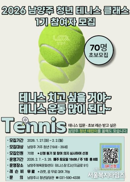 서울복지타임즈 이재연 기자 | 남양주시는 27일부터 내달 2일까지 ‘2026 남양주 청년 테니스 클래스 1기’ 참여자를 모집한다고 밝혔다.