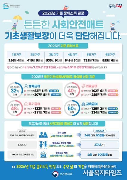 2026년도 기준 중위소득은 1인 가구 기준 256만 4천 원으로, 지난해 239만 2천 원 대비 7.2% 인상된다. 이에 따라 1인 가구의 기초생계급여 지원액도 기존 76만 5천 원에서 82만 원으로 상향 조정된다.