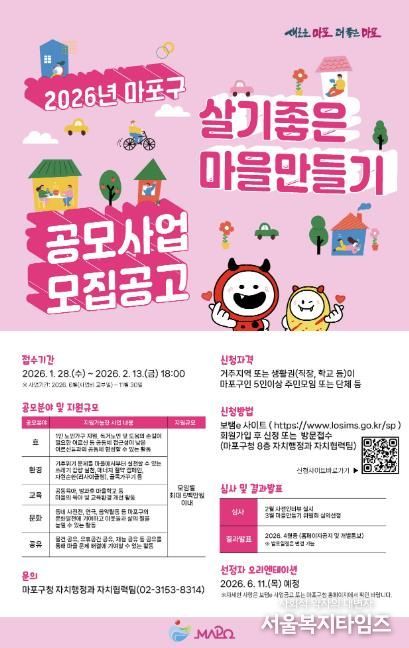 서울복지타임즈 이재연 기자 | 마포구는 주민이 제안한 아이디어를 지원해 마을공동체 활성화를 도모하는 ‘2026년 마포구 살기좋은 마을만들기 공모사업’ 참여 대상자를 2월 13일까지 모집한다.