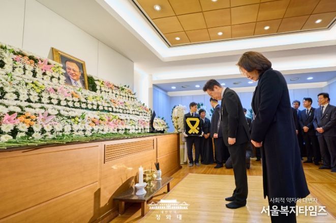 서울복지타임즈 이재연 기자 | 이재명 대통령과 김혜경 여사가 1월 27일 서울 종로구 서울대병원 장례식장에 마련된 고 이해찬 전 총리 빈소를 찾아 영정을 향해 묵념하고 있다.