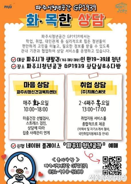 서울복지타임즈 이재연 기자 | 파주시는 청년들의 심리 안정과 취업 역량 강화를 위해 파주시청년공간 지피(GP)1939에서 진행하는 상담 프로그램 ‘화·목한 상담’의 참여자를 모집한다.