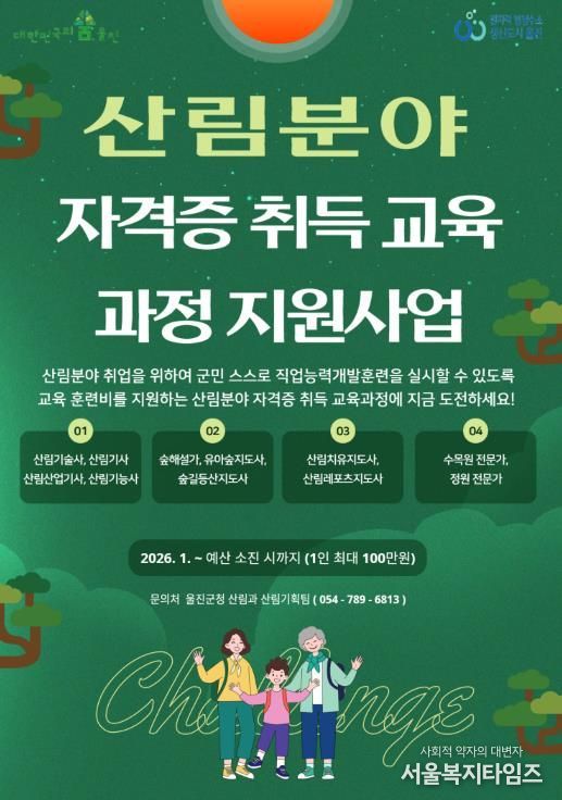 서울복지타임즈 이재연 기자 | 울진군은 군민의 산림분야 취업지원을 위하여 자기주도 직업능력개발훈련을 지원하는 산림분야 자격증 취득 교육과정 지원사업을 실시한다.