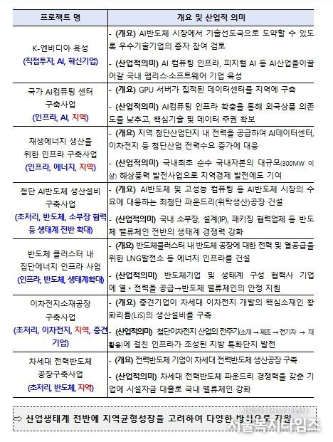 지난 12.19일 발표한 7건의 1차 메가프로젝트는 반도체 및 AI 등 첨단전략산업 및 그 생태계 발전에 파급효과가 큰 사업으로 서로 연계되어 시너지 효과를 낼 것으로 기대되며, 지역성장에 기여하는 등 산업적 의미가 큰 사업으로 구성되어 있다.