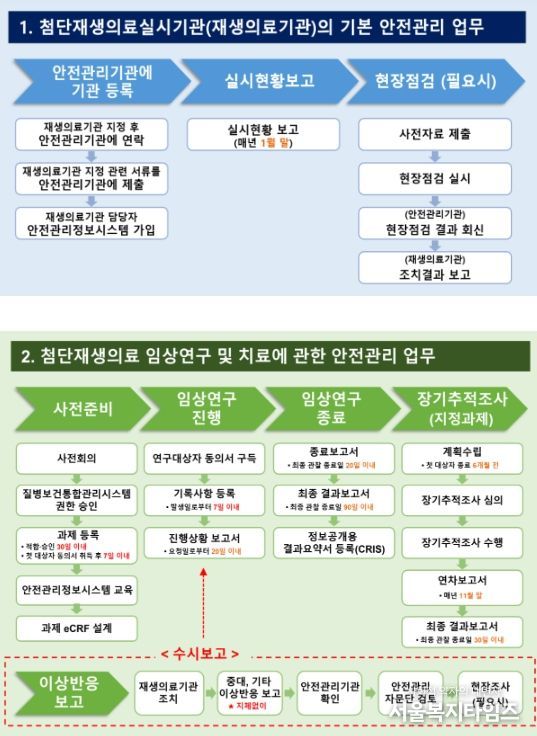 서울복지타임즈 이재연 기자 | 질병관리청 국립보건연구원은 첨단재생의료 현장에서의 환자 안전을 확보하기 위해 '첨단재생의료실시기관 안전관리 업무안내서'를 배포한다. 해당 안내서에는 첨단재생의료기관이 첨단재생의료 실시 과정에서 필수적으로 준수해야 할 안전관리 사항을 사례중심으로 담았다.