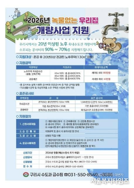 서울복지타임즈 이재연 기자 | 구리시는 2026년 수도관 개량 공사비 지원 사업의 신청을 오는 2월 2일부터 접수한다고 밝혔다.