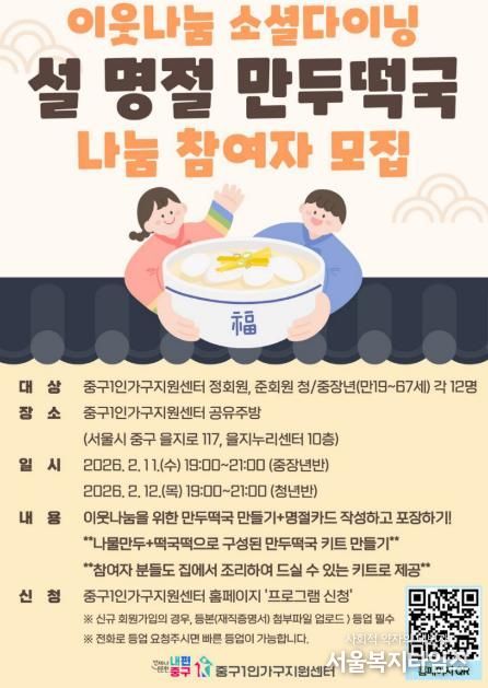 서울복지타임즈 이재연 기자 | 서울 중구는 설 명절을 앞두고 오는 4일부터 14일까지 중구1인가구지원센터에서‘설맞이 특별 프로그램’을 운영한다.
