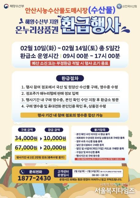 서울복지타임즈 이재연 기자 | 안산시는 설 명절을 맞아 국산 수산물 소비 촉진과 도매시장 활성화를 위해 오는 10일부터 14일까지 5일간 ‘2026년 설 온누리상품권 환급행사’를 개최한다고 5일 밝혔다.