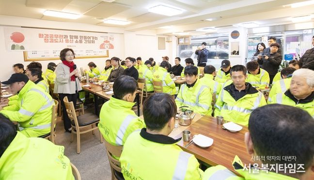 용산구는 4일 지역 내 음식점에서 ‘환경공무관과 함께하는 청결도시 용산 소통간담회’를 열고, 도로·골목·상권 등 청소 현장에서 근무하는 환경공무관들의 애로사항을 청취하고 노고를 격려했다. 이날 간담회에는 박희영 용산구청장을 비롯해 환경공무관 60여 명이 참석했다.