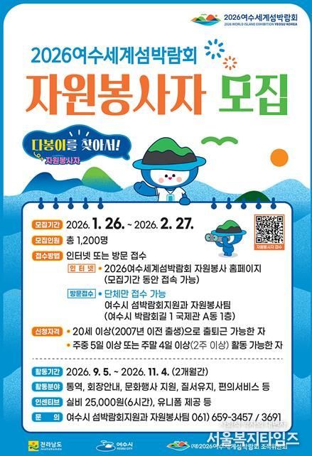 서울복지타임즈 이재연 기자 | 여수시는 2026여수세계섬박람회 성공적인 개최를 위해 자원봉사자 다봉이(“다함께 봉사합니다”)를 모집 중이며 시민 참여 확대를 위해 “찾아가는 자원봉사 모집 설명회”를 운영할 계획이다.