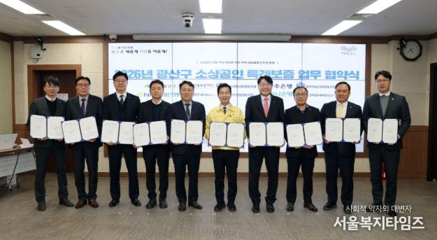 서울복지타임즈 이재연 기자 | 광주 광산구가 6일 구청 2층 회의실에서 광주신용보증재단(이사장 염규송), 지역 금융기관 8개소(△광주어룡신협·광주하남신협·우산신협 △광주은행 △하나은행 △농협△서광주새마을금고·한마음새마을금고)와 함께 ‘2026년 광산구 소상공인 특례보증 업무협약’을 체결했다.