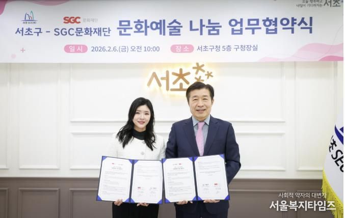 서울복지타임즈 이재연 기자 | 서울 서초구는 지난 6일 재단법인 SGC문화재단과 ‘문화예술 나눔 협약’을 체결하고 지역 기반 문화나눔 사업을 공동으로 추진해 나가기로 했다고 밝혔다.