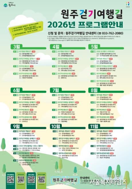 서울복지타임즈 이재연 기자 | 트레킹 도시 원주시는 3월부터 11월까지 ‘2026년 원주걷기여행길 프로그램’을 운영한다. 이번 프로그램은 원주의 역사·문화·생태 자원을 직접 보고, 느끼고, 체험하는 활동을 통해 걷기 운동을 확산하고 시민 건강 증진에 기여하는 것을 목표로 한다.