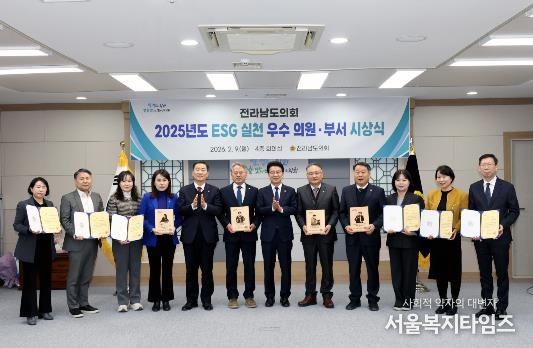 서울복지타임즈 이재연 기자 | 전라남도의회는 2월 9일 도의회 4층 회의실에서 2025년도 ESG 실천 우수 의원·부서 시상식을 개최했다.