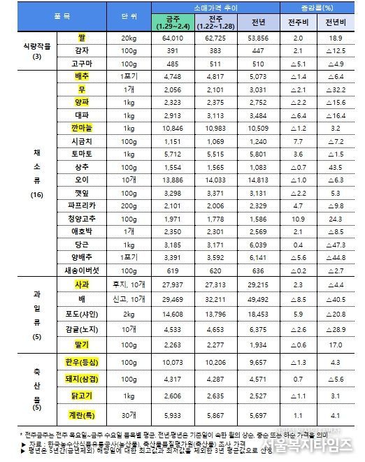 수급 점검 결과 전반적인 설 성수품 가격은 전년 수준으로 비교적 안정적인 흐름을 보이고 있고, 설 차례상 비용도 전년보다 소폭 하락했다. 다만, 대과 위주의 선물용 사과와 지난해 가격이 낮았던 쌀과 한우는 다소 높은 수준을 보이고 있다.