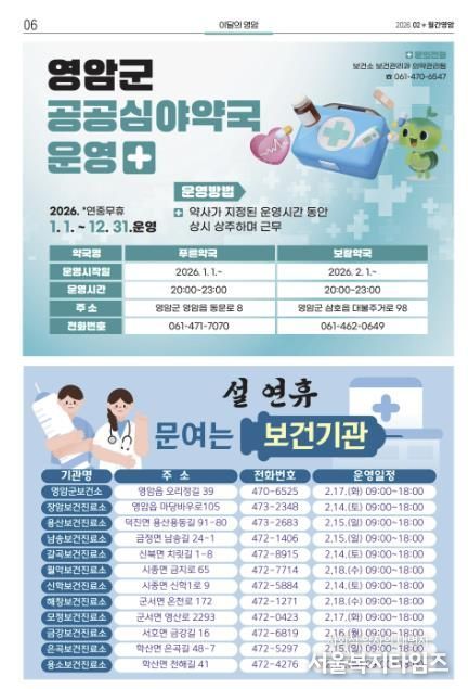 설 명절 연휴 기간 문 여는 병·의원과 약국은 영암군 반상회보 ‘월간영암’ 2월호, 영암군홈페이지 열린군정'영암소식'반상회보(월간영암)에서 볼 수 있다.