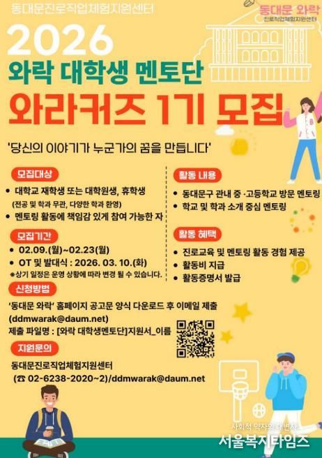 서울복지타임즈 이재연 기자 | 동대문구가 위탁 운영하는 진로직업체험지원센터 와락은 동대문구 청소년들의 진로 탐색을 지원하기 위해 멘토단 '와라커즈(WARAKERS)' 1기를 공개 모집한다. 와라커즈(WARAKERS)는 ‘와락(WARAK)’과 ‘-ers’를 결합한 명칭으로, 와락과 함께 청소년의 진로 성장을 이끌어가는 사람들을 의미한다.