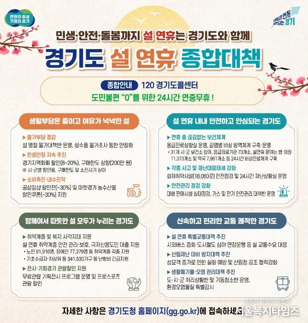 서울복지타임즈 이재연 기자 | 경기도가 도민들이 따뜻하고 편안한 명절을 보낼 수 있도록 ‘설 연휴 종합대책’을 추진한다.