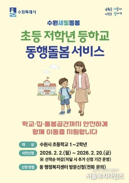 서울복지타임즈 이재연 기자 | 수원특례시가 ‘초등 저학년 등하교 동행돌봄서비스’ 사전 신청 기간을 운영한다.