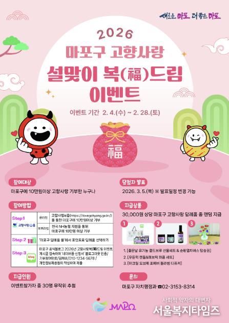 서울복지타임즈 이재연 기자 | 마포구는 설 명절을 맞아 고향사랑기부제 참여를 확대하고 기부 문화를 확산하기 위해 ‘2026년 설맞이 고향사랑 복(福)드림 이벤트’를 2월 4일부터 28일까지 운영한다.